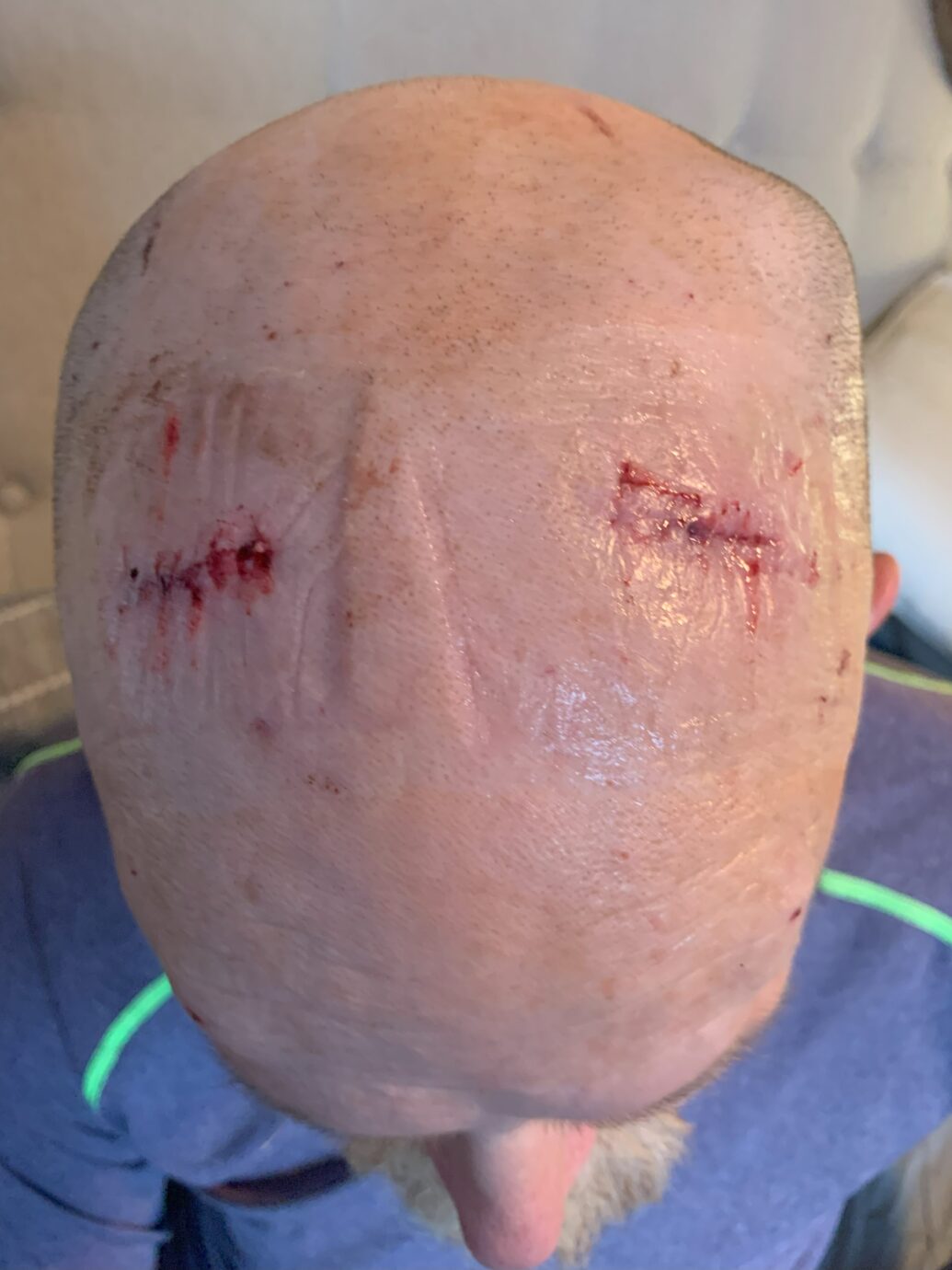 After about an hour and a half the doctor came out and told me surgery went well and they would be moving Dave to recovery. Once they moved Dave from the recovery room to his room on the Acute Neurology floor, I would be able to be with him. That ended up being at almost 7 o’clock at night and by then, I’m not going to lie-I was getting a bit irritable about not being able to be with my husband. Eventually, I was able to meet him in his patient room and spend some time with him before I went home to be with our teenager. All in all, he came through the first surgery okay. He felt unsteady the first couple of days, but his incisional pain was pretty manageable. He had two incisions on top of his head, through which they drilled through his skull so that they could introduce the DBS wires into Dave’s brain. The doctor said the actual drill holes in the skull were only about 3 mm wide and they would close up on their own over time. The surplus length of the initial two wires were coiled under the skin on top of Dave’s head until the second surgery.
